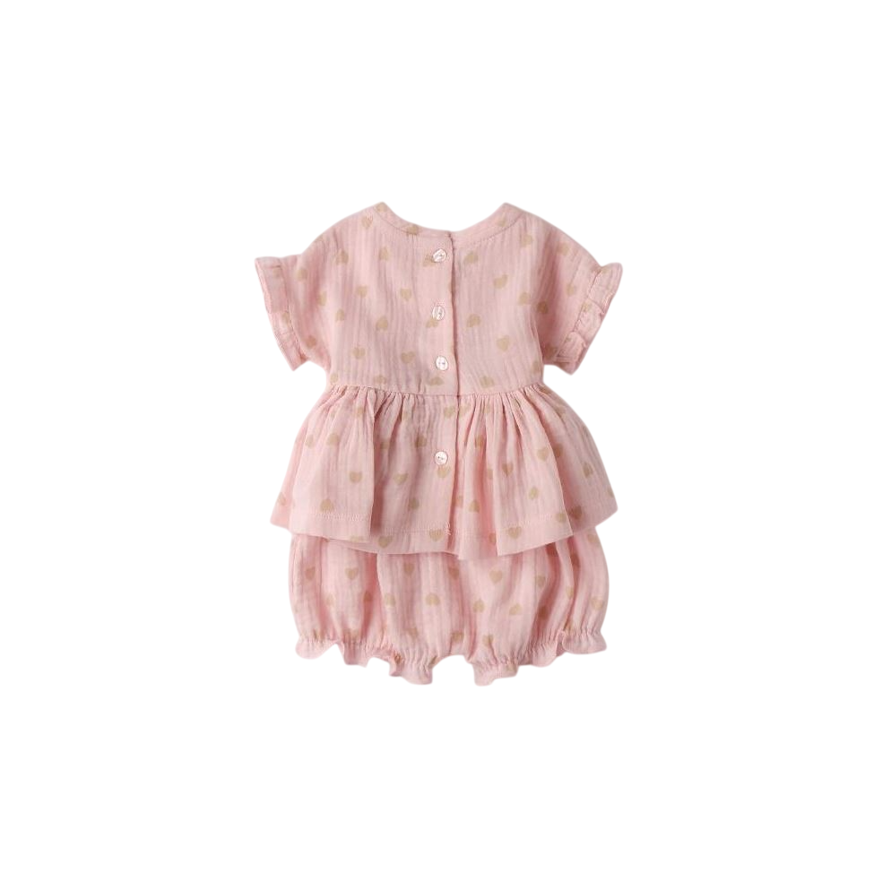 completo in cotone mussola a fantasia cuori composto da blusa svasata a mezza manica e chiusura bottoni sul retro, coulotte abbinate