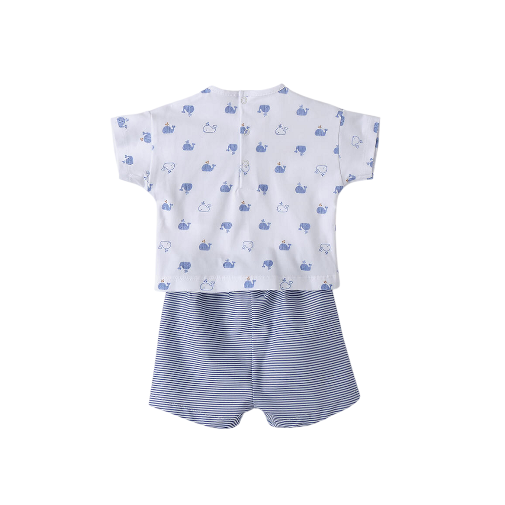 completo composto da t-shirt a mezza manica a fantasia balene, dettaglio taschino a righe in richiamo della bermuda con elastico in vita