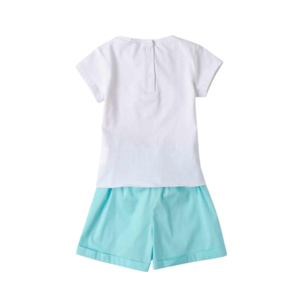 completo composto da t-shirt a mezza manica con stampa unicorno e arcobaleno sul davanti a contrasto colore, shorts in tinta unita con elastico e fusciacca in vita