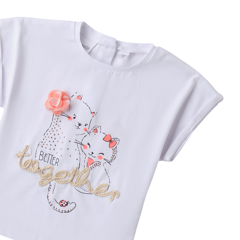 t-shirt a mezza manica in tinta unita con stampa frontale gattini, dettagli in strass e applicazione fiore