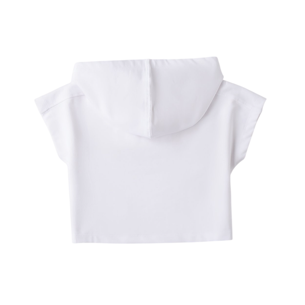 felpa crop in tinta unita con mancia corta e cappuccio, dettaglio scritta in rilievo sul davanti