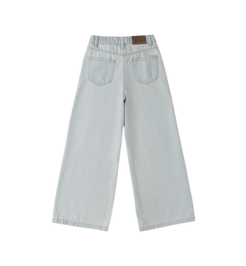 jeans palazzo dal lavaggio chiaro e con dettaglio strappi, coulisse interna in vita