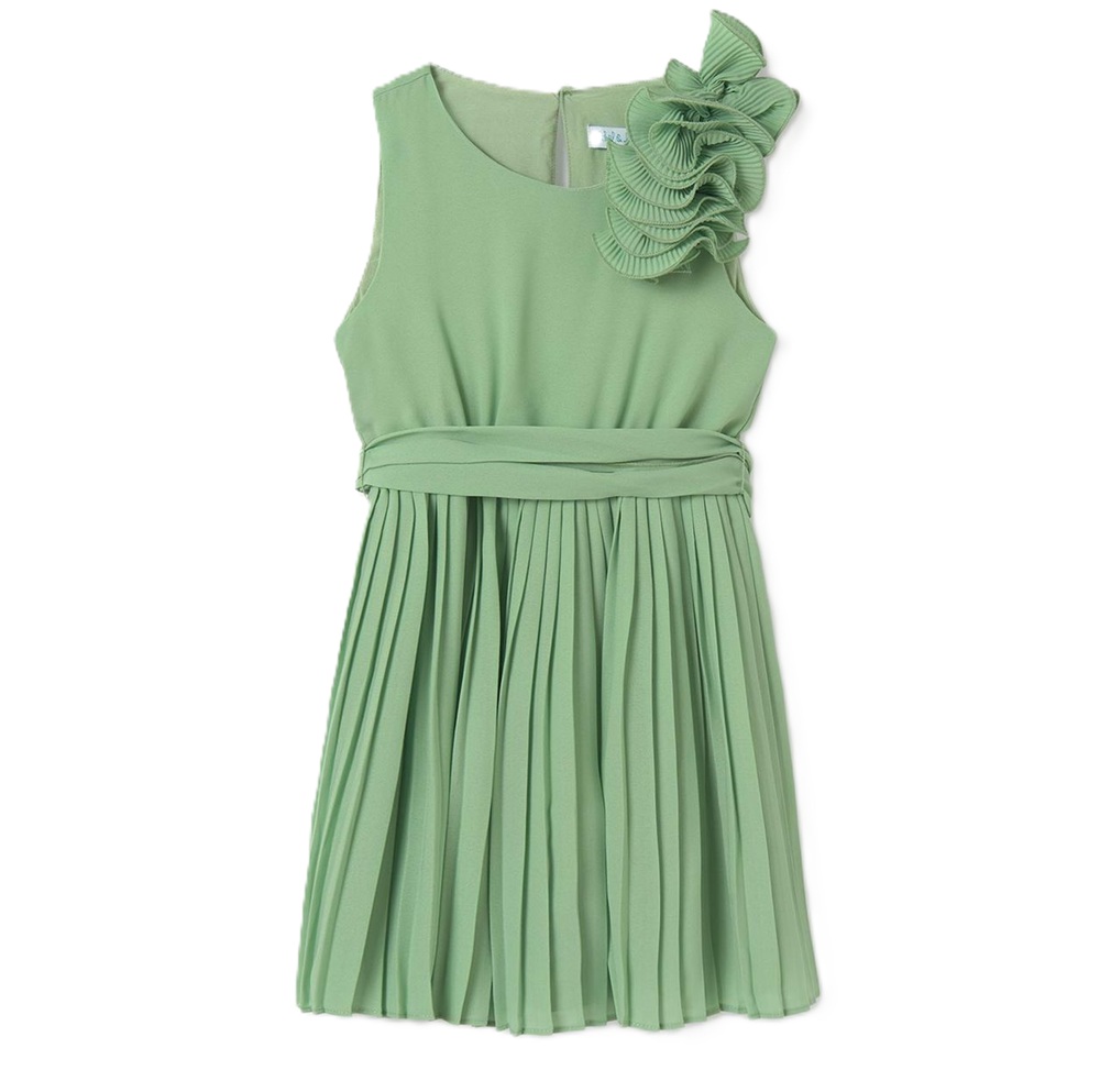 Abito chiffon plissettato tinta unita con fodera interna in cotone, dettaglio decorativo sulla spalla, fusciacca dello stesso tessuto.Chiusura con unico bottone in madreperla dello stesso colore nella parte posteriore.