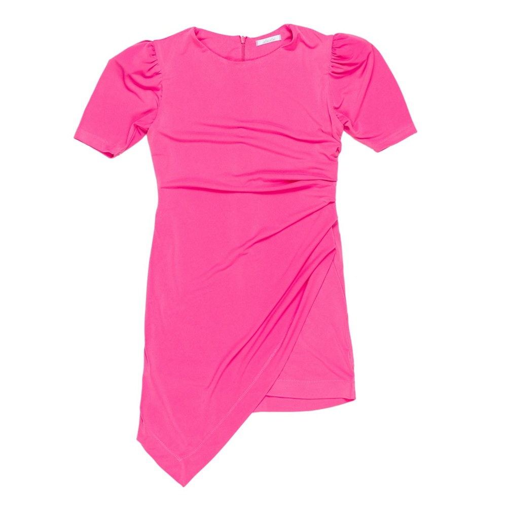 Abito manica corta tinta unita con drappeggio laterale, chiusura posteriore con zip