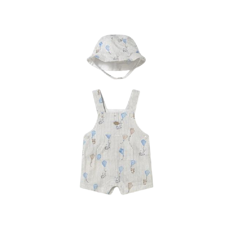 completo a fantasia rigata con orsetti ed elefanti, composto da salopette a pantaloncino con tasca frontale e cappello in coordinato