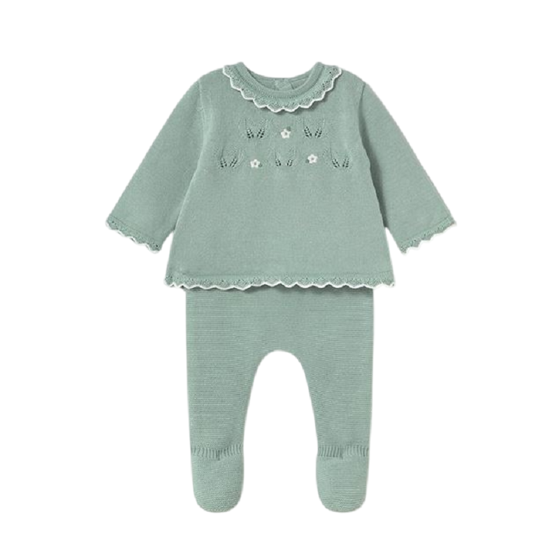 completo in filo tinta unita composto da maglia con profili lavorati e dettaglio traforato sul davanti, ghettina in coordinato