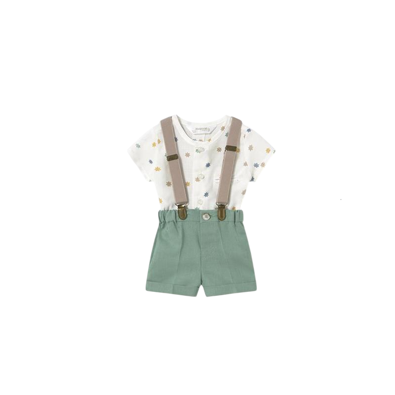 Completo 3 pezzi composto da: camicia tinta unita con stelle multicolore all over, bermuda tinta unita e bretelle in coordinato