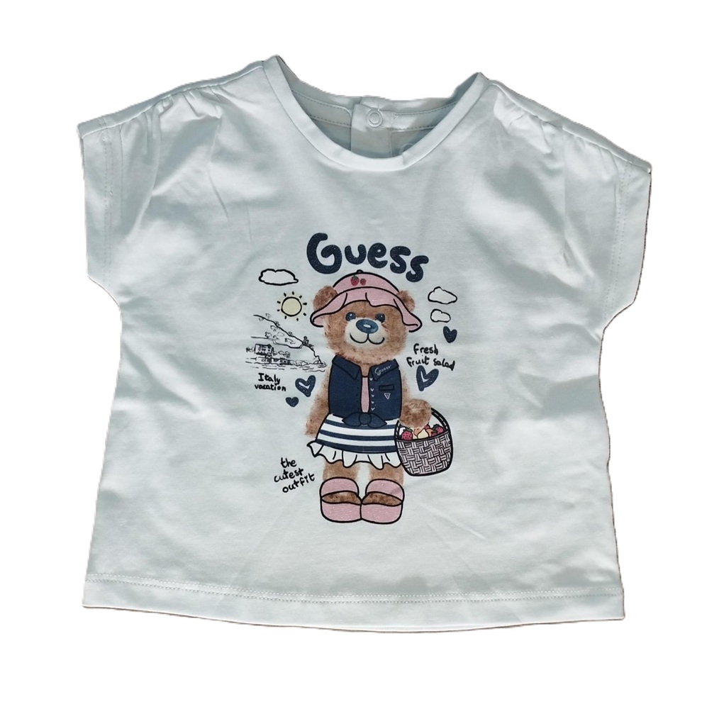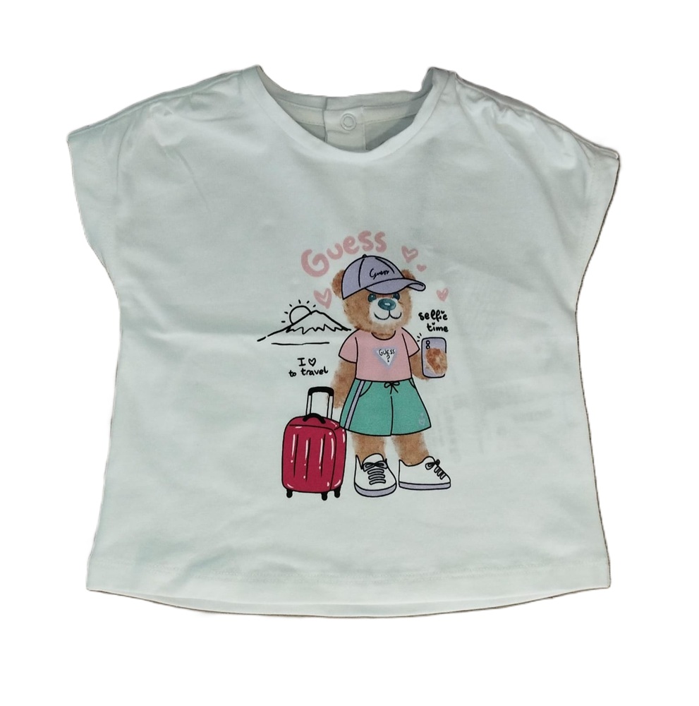 T-shirt manica corta tinta unita con stampa teddy anteriore a contrasto e chiusura posteriore con bottoni automatici