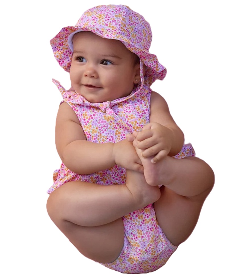Pagliaccetto fantasia fiori con volant e cappello in coordinato