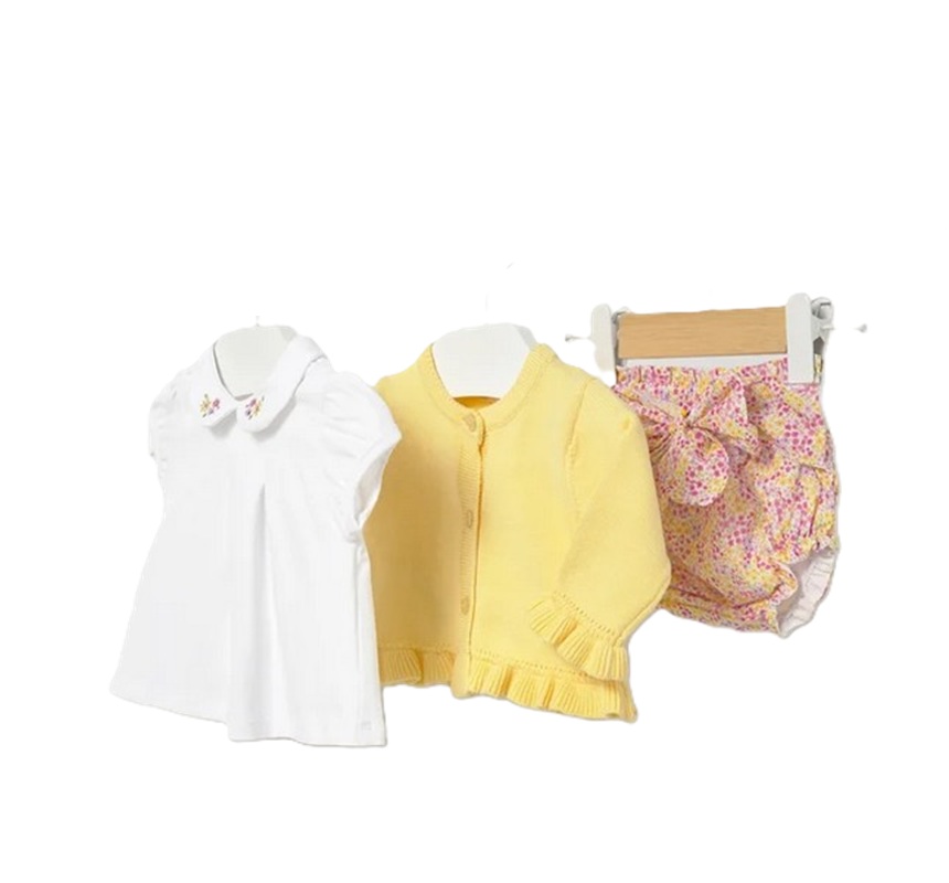 Completo 3 pezzi composto da: cardigan in filo con dettagli traforati, t-shirt manica corta con colletto ricamato e pinces e coulotte a fiori in coordinato