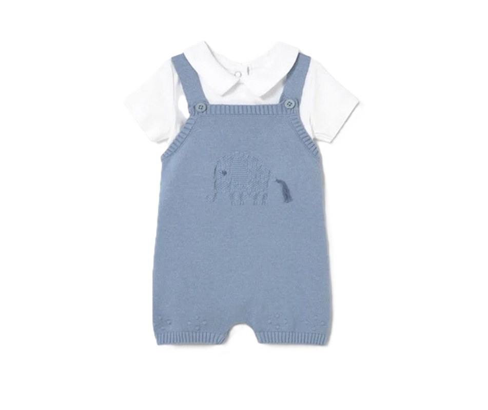 completo composto da body in tinta unita con colletto e mezza manica, salopette in filo con ricamo elefante tono su tono