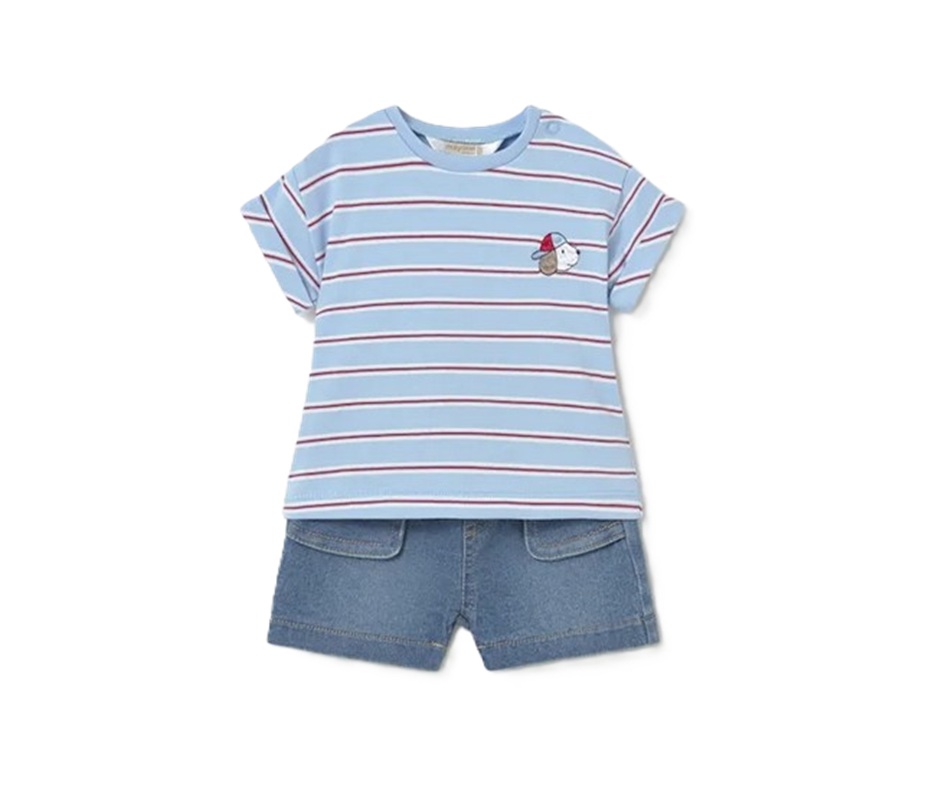 Completo 2 pezzi composto da: t-shirt manica corta a righe con ricamo/tinta unita con stampa leone e bermuda in denim/ a righe