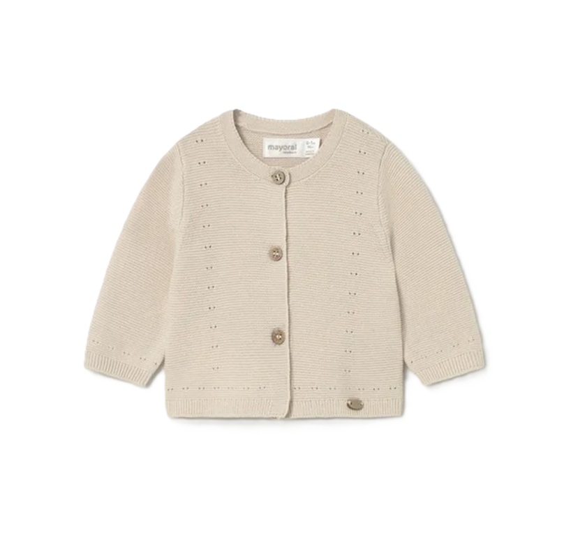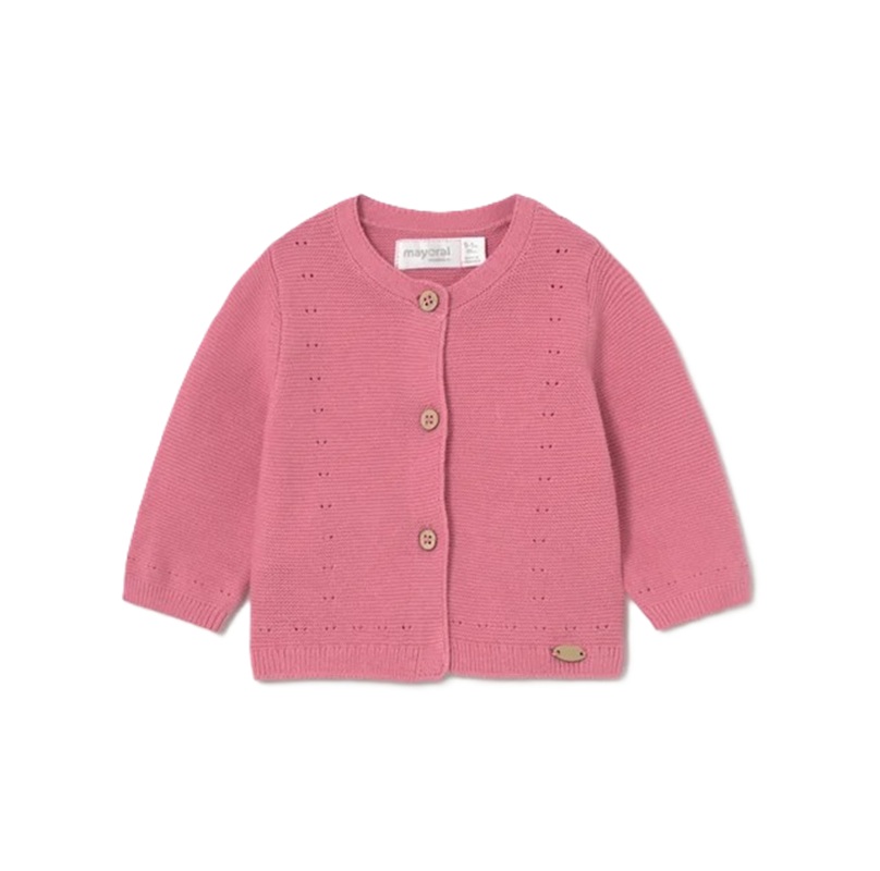 Cardigan tinta unita traforato, chiusura con bottoni effetto legno