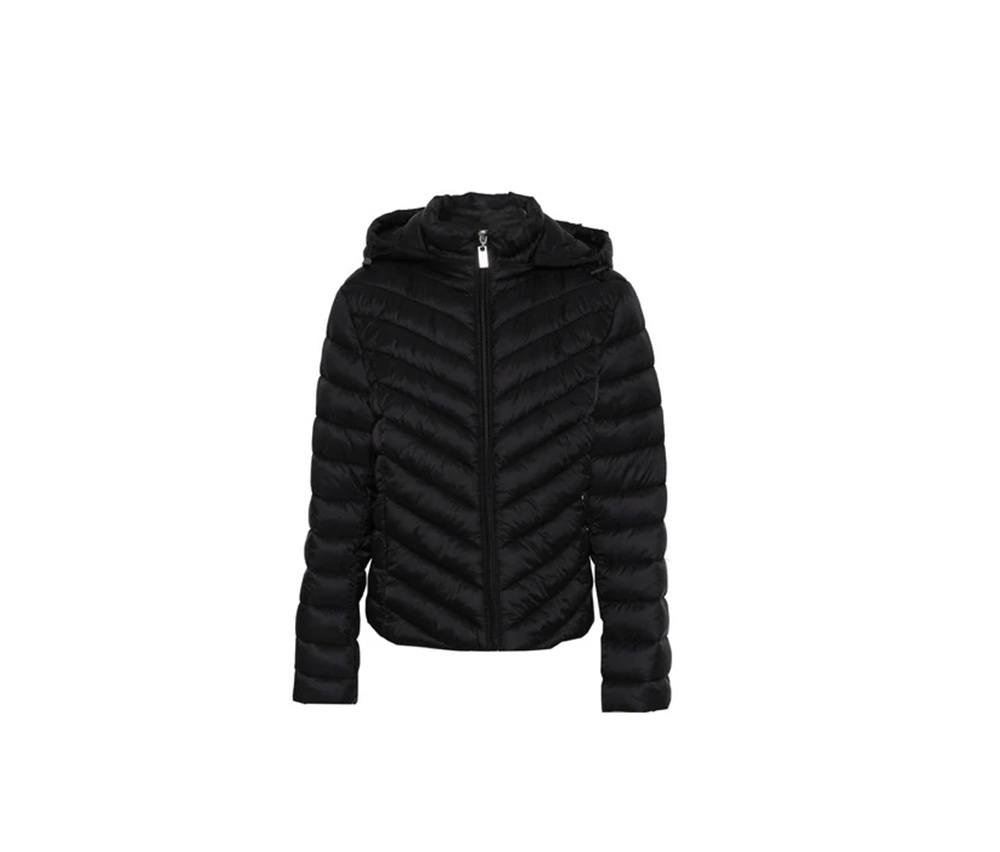 Piumino 100 grammi tinta unita con chiusura zip e tasche a filo, cappuccio removibile, modello sfiancato