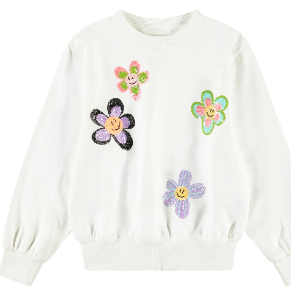 Felpa tinta unita con profili a costine e ricamo margherite paillettes