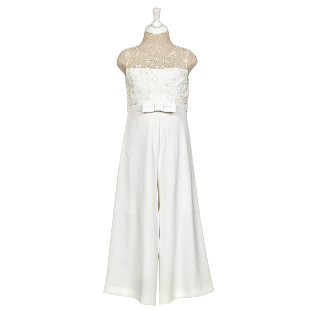 jumpsuite palazzo , parte superiore in pizzo con filo laminato, scollatura sul retro e dettaglio cinta con fiocco in vita